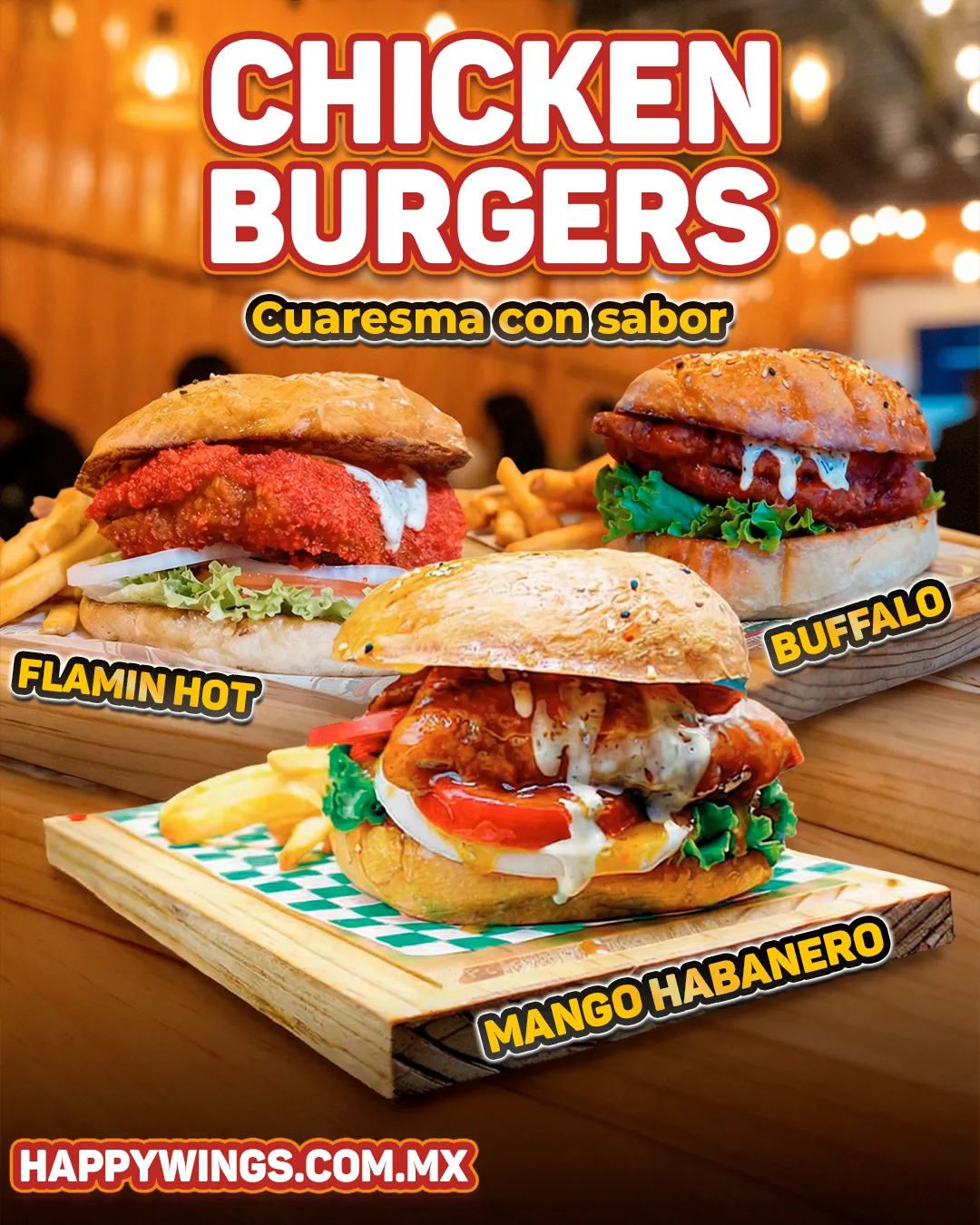 Programa tu visita y asegura tu mesa en Happy Wings. Disfruta de nuestras deliciosas hamburguesas, alitas y más en un ambiente vibrante y acogedor.